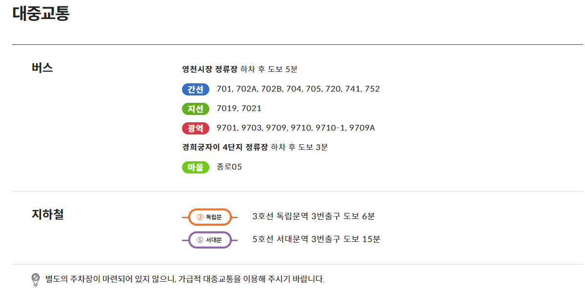 - 휴관일 : 1월 1일 설-추석 연휴, 매주 월요일 (공휴일인 경우 그 다음날)