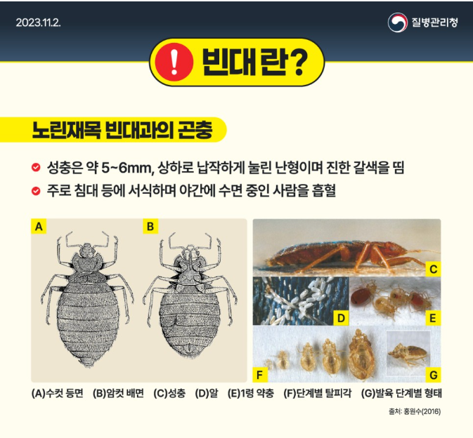 • 빈대의 생김새 : 빈대는 빨간색이나 갈색의 작은 벌레입니다. 빈대의 침입 여부를 확인하기 위해 침구류나 가구 등에 빈대가 있는지 살펴보는 것이 좋습니다.