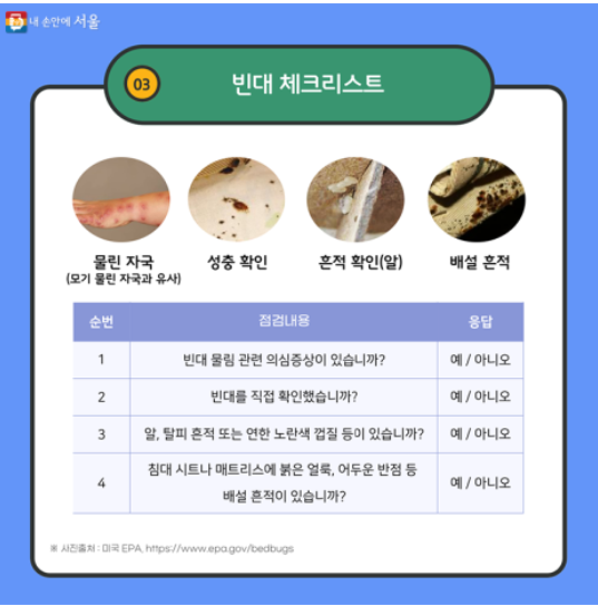 • 빈대의 주 서식지 : 빈대는 사람의 옷이나 가방 등에 숨어 있을 수 있으므로, 여행이나 출장을 다녀온 후에는 옷과 가방을 깨끗이 세탁하는 것이 좋습니다.