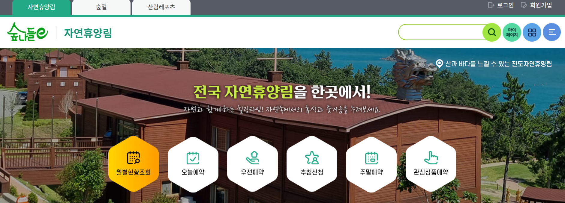 숲나들e는 전국의 자연 휴양림을 한 곳에서 예약할 수 있는 통합 플랫폼입니다. 국립 자연 휴양림, 국립 수목원, 국립 공원, 국립 해양 휴양림, 지방 자치 단체가 운영하는 자연 휴양림, 수목원, 생태 공원 등 다양한 산림 휴양 시설을 예약할 수 있습니다.