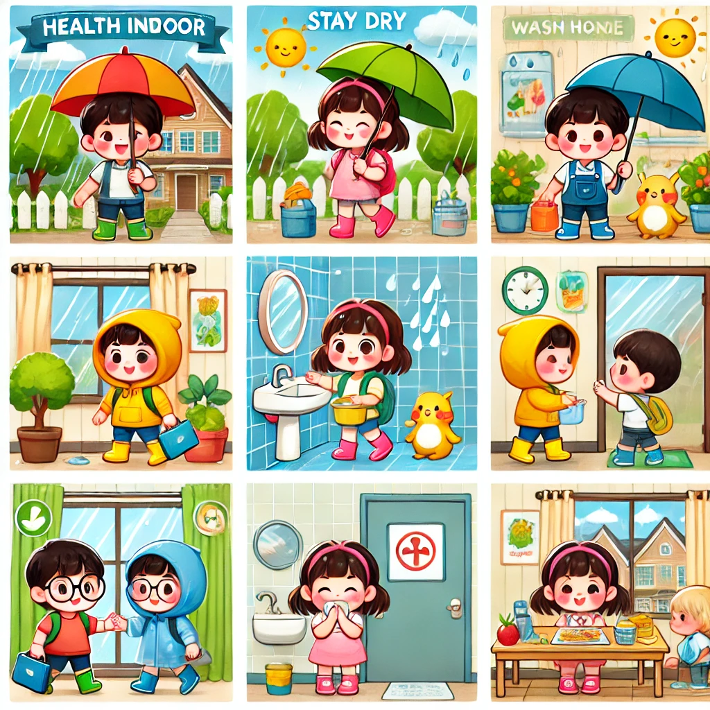 - 손세정제와 손씻기 교육 : 장마철에는 지루함을 이겨내기 위해 실내에서 다양한 활동을 하게 됩니다. 어린이들에게 올바른 손씻기 방법과 손세정제 사용법을 교육하여, 손 위생 관리를 철저히 하도록 유도해야 합니다. 이를 통해 위생 상태를 개선하고 질병 전파를 예방할 수 있습니다.
