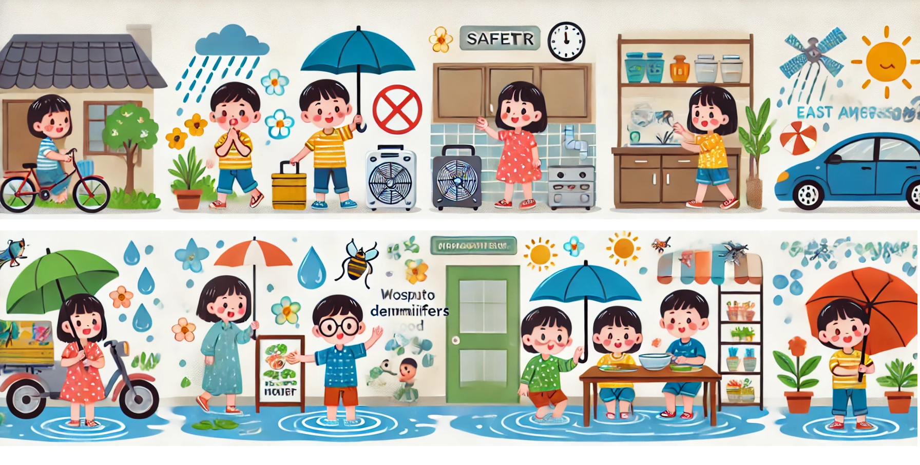 - 물에 의한 사고 : 장마철에는 폭우로 인해 홍수나 물이 차오를 수 있습니다. 아동이 높은 물에 가지 않도록 감시하고, 물놀이 시 안전에 유의해야 합니다.