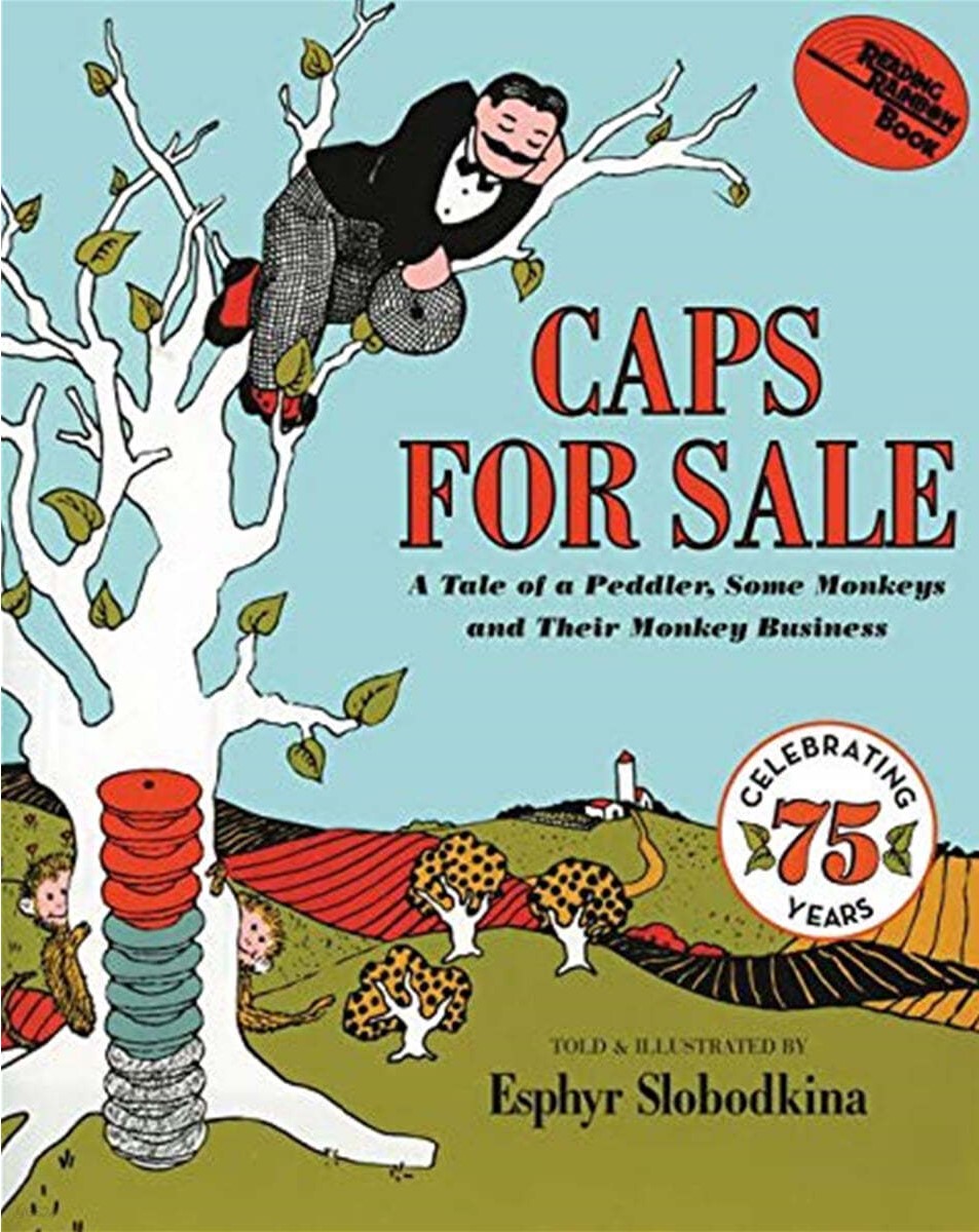 "Caps for Sale" introduces us to a peddler who walks around selling caps. He balances a stack of his wares on his head, with his own checked cap at the top, followed by a bunch of gray, brown, and blue caps. One day, feeling tired, he takes a nap under a tree, leaving his wares on his head.