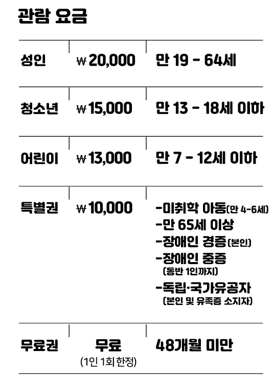 - 티켓 가격: 성인 20,000원 / 청소년 15,000원 / 어린이 13,000원 (만 48개월 이하는 무료)